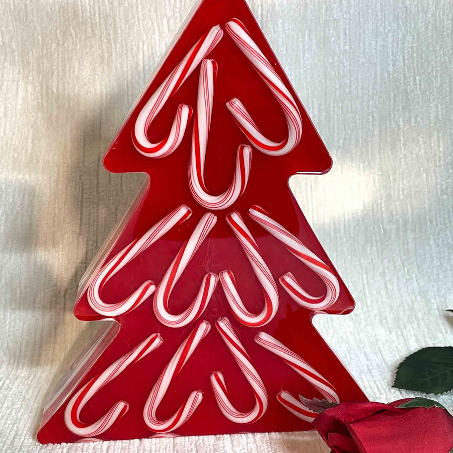 Reversable tree to match your holiday decor. One side has real candy canes on a red background and the other has candy canes on a white background. Thick enough to be free standing.
