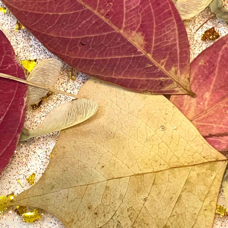 These small rimmed trays can hold a collection of any small items: glasses, coins, jewelry, or serve as a coaster or candy dish. This handmade dish has real dried fall leaves with a chocolate brown rim and clear background with some gold and brown glitter for a touch of class.