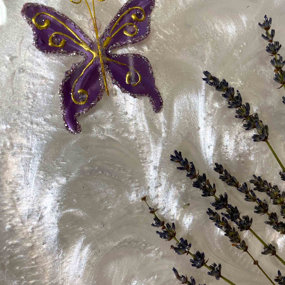 This is a great gift for nature lovers. It’s a round charcuterie board with natural dried lavender and a blinged-out purple butterfly to match.