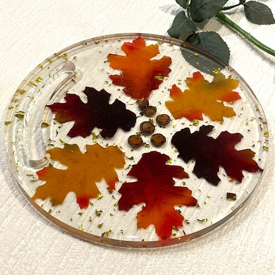 Festive for fall and football tailgate season. This clear tray with real acorns and silk oak leaves will display your snacks with flair. A touch of gold glitter is the finishing touch. Built in handle.