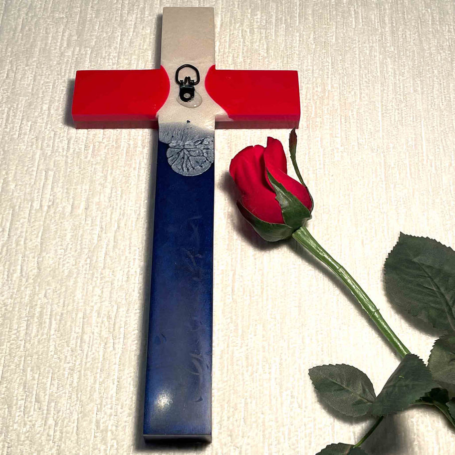 Honor a Veteran for their service. This handmade Veteran cross is red, white & blue with a challenge coin embedded in the center . The back has a hook to hang the cross on a wall.