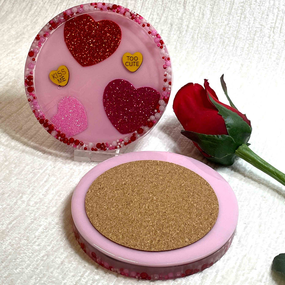 Get one for your valentine! These will be around long after the flowers have wilted and the chocolate is all gone. These handmade rimmed coasters have sparkle hearts and those cute little candies we loved as kids. The rim is filled with valentine sparkle too, The background is a light pink. Has a cork backing to protect your table top.