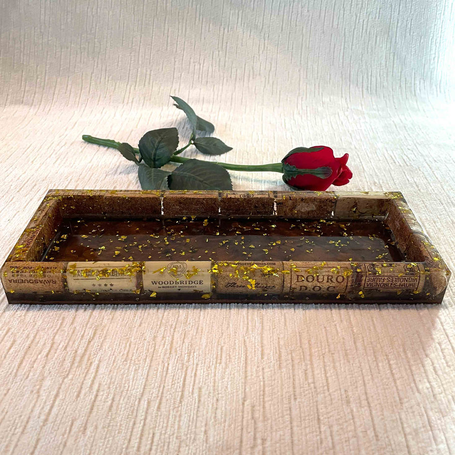 This shallow rimmed tray has many uses: wine bottle and glass coaster, snack tray, large trinket tray, or centerpiece. The possibilities are endless. It is chocolate brown with gold glitter and wine corks embedded in the resin all around the rim.